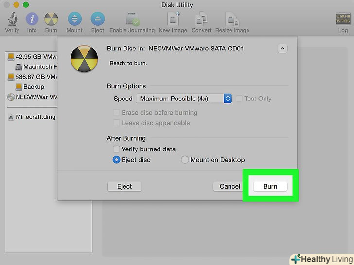 Клацніть поЗапис.ця опція знаходиться в нижній частині спливаючого вікна. Запуститься процес запису ISO-файл на DVD-диск. Коли процес буде завершено, вийміть DVD-диск з приводу.- Процес запису може зайняти від декількох хвилин до декількох годин в залежності від розміру ISO-файлу.