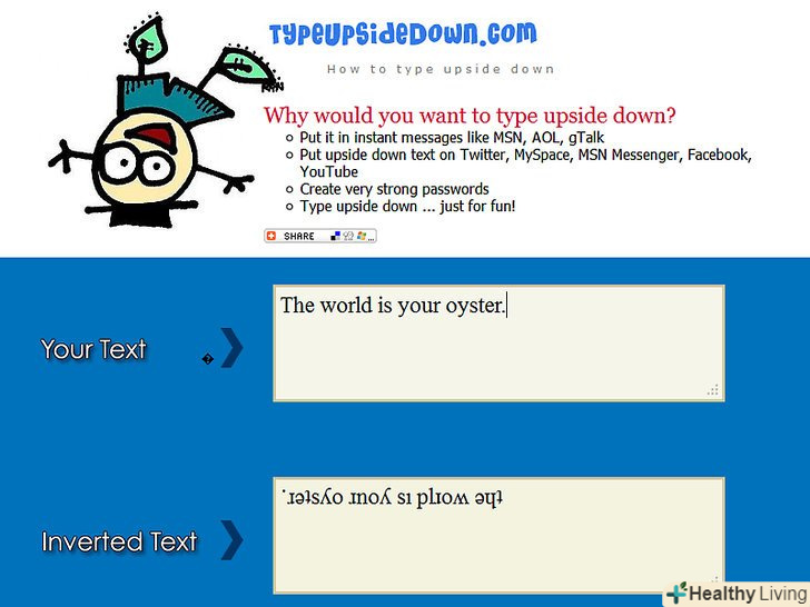 Виберіть сайт, який "переведе" ваш текст в текст догори ногами. Вбийте його! Як мовиться англійською, Ми-господарі власної долі (»the world is your oyster"). Або в перевернутому варіанті: «ıqƍqɓʎɔ ņоннǝʚɯɔƍоɔ ɐʚǝʁεох – ıqw» («ɹǝʇsʎo ɹnoʎ sı plɹoʍ ǝɥʇ»).- Запам'ятайте, що, так як текст розташований догори ногами, читати його слід справа-наліво. А ви-то думали, що це лише хихоньки та хахоньки.