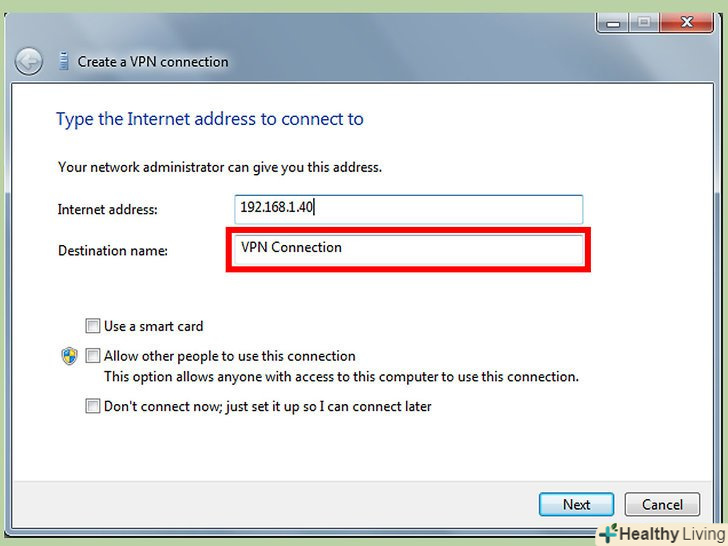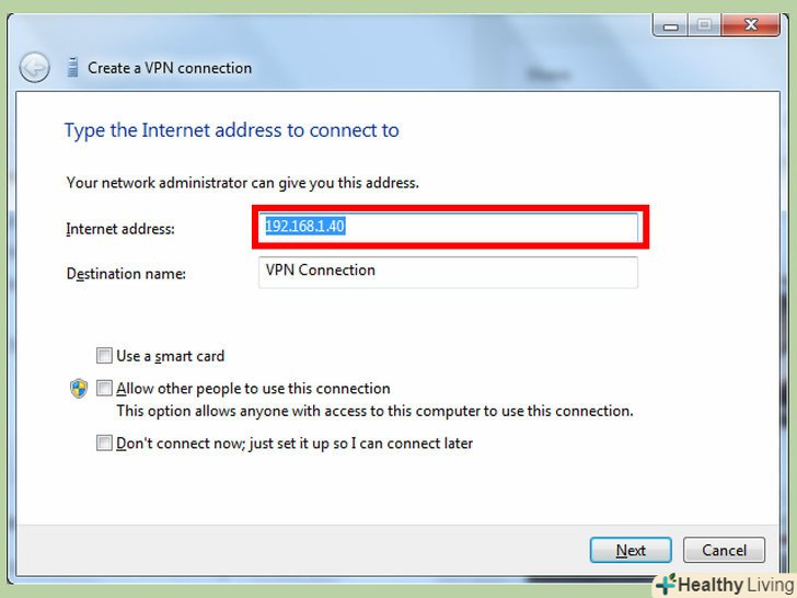 Налаштуйте вихідне VPN з'єднання.- В поле "Інтернет-адреса" необхідно ввести доменне ім'я Або IP-адресу комп'ютера або сервера, до якого ви хочете підключитися. Якщо у вас немає цієї інформації, зв'яжіться з системним адміністратором (адміном), керуючим мережею.