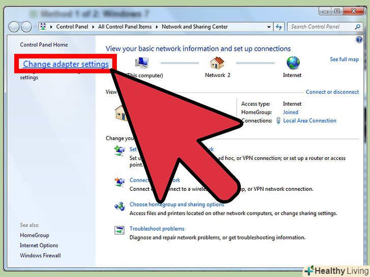 - Натисніть на опцію «центр управління мережами і загальним доступом", а потім на "Зміна параметрів адаптера", щоб налаштувати з'єднання.