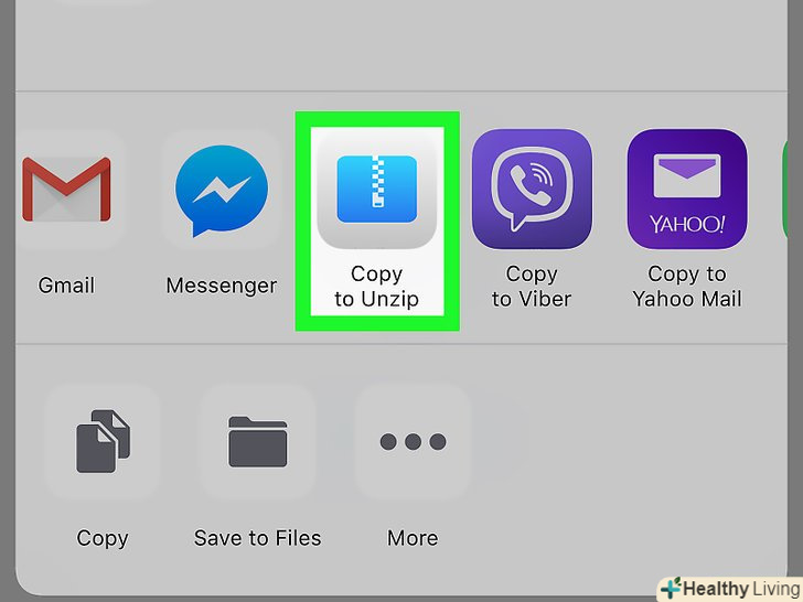 Прокрутіть вправо і натиснітьКопіювати в Unzip.ви знайдете цю опцію вгорі меню. Запуститься додаток Unzip.