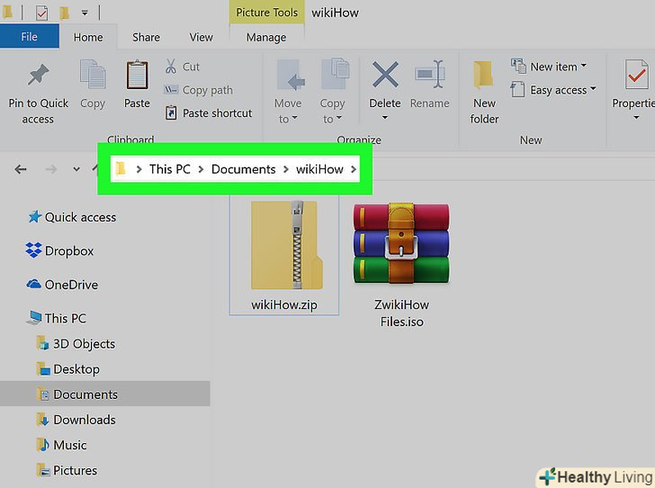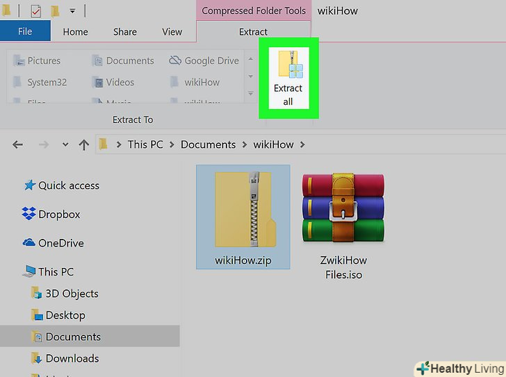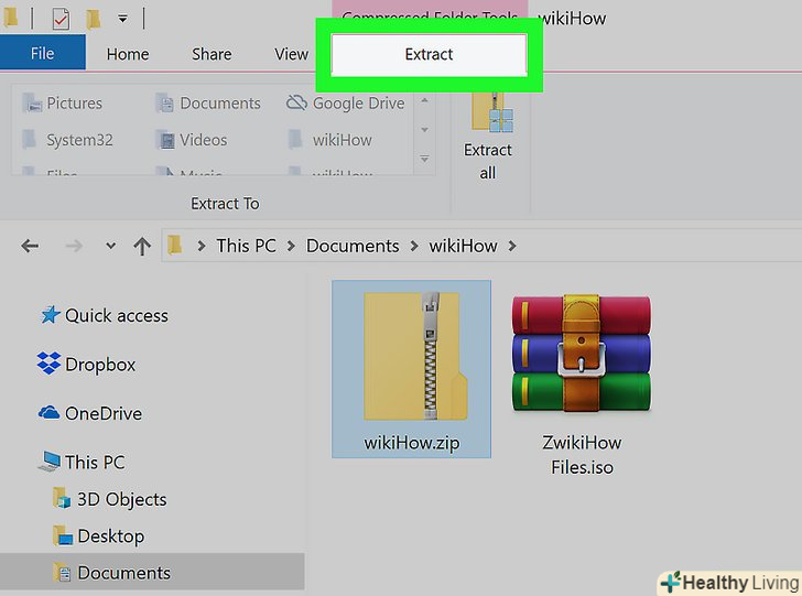 Вийміть вміст ZIP-файлу в іншу папку (якщо необхідно).за замовчуванням вміст архіву буде вилучено в папку, в якій знаходиться ZIP-файл. Щоб витягти файли в іншу папку:- Натисніть на zip-файл, щоб вибрати його.
