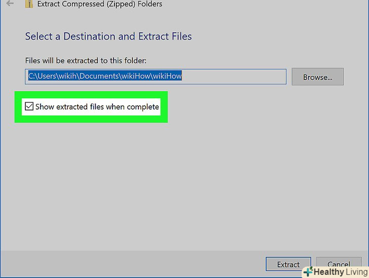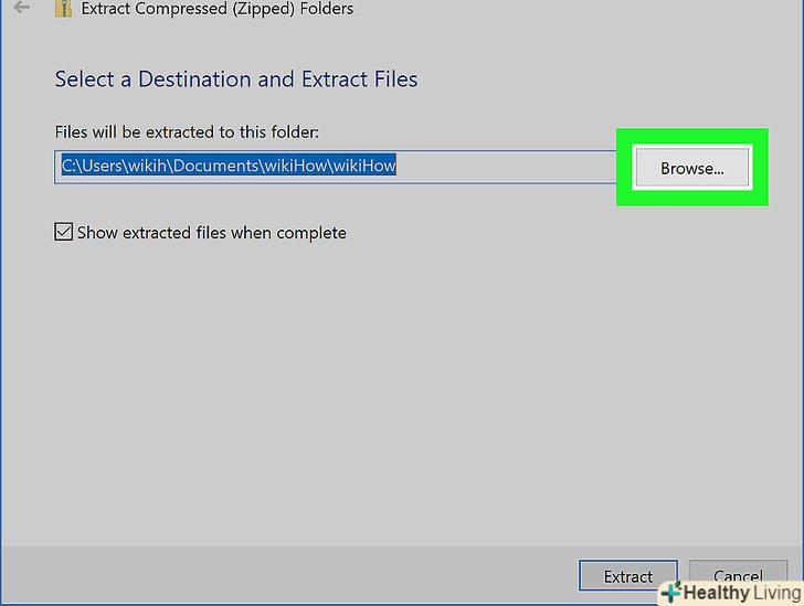 Виберіть папку, в яку будуть вилучені файли.за замовчуванням файли будуть витягнуті в ту ж папку, в якій знаходиться ZIP-файл (наприклад, якщо архів знаходиться на робочому столі, файли будуть витягнуті на робочий стіл). Щоб витягти файли в іншу папку:- Натисніть "Огляд" праворуч від текстового поля посередині вікна.