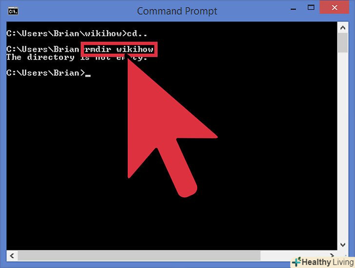 Видаліть порожню папку.щоб видалити папку, скористайтеся командою rmdir. Поки ви перебуваєте в папці, її не можна буде видалити (дивись крок 10). Якщо папка порожня (у ній немає файлів), її можна видалити, просто ввівши команду rmdir -gt; ім'я папки. У нашому прикладі в папці wikihow все ще знаходиться файл newFile1, так що команда rmdir не спрацює. Як показано на прикладі вище, якщо папка не порожня, Ви отримаєте повідомлення про помилку.
