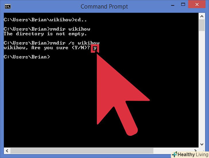 Видаліть папку з файлами. щоб видалити папку, в якій містяться файли, скористайтеся зміненою командою rmdir. Введіть команду rmdir /s wikihow. Введіть rmdir / s wikihow і натисніть Enter. З'явиться вікно підтвердження видалення папки, введіть Y або N. введіть Y, щоб підтвердити видалення, або n, щоб скасувати його. Коли ви введете Y, папка і весь її вміст будуть видалені з системи.