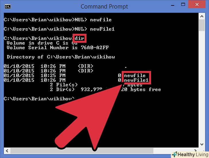Перевірте вміст папки.Тепер перевірте вміст папки за допомогою команди dir. Як показано на прикладі зверху, папка wikihow тепер містить два нових файли: newFile і newFile1.