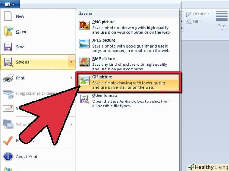 Створіть зображення.потім відкрийте меню "Файл", далі " Зберегти як."У полі" назва файлу " введіть, власне, назву файлу, а під ним, в поле "Зберегти як", виберіть формат "GIF" зі списку.
