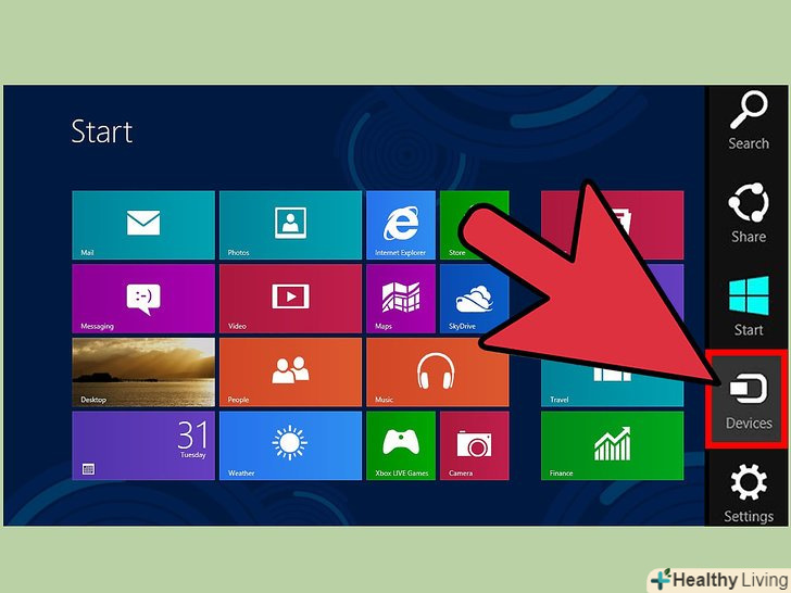 Проведіть пальцем справа наліво, а потім торкніться розділу "Пристрої".- Якщо ви використовуєте мишу, Наведіть курсор на нижній правий кут екрану, а потім підніміть його вгору і натисніть на «пристрої».