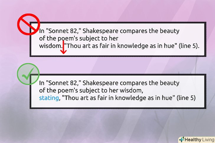 Наведіть цитату. уявіть цитату і включіть її текст в лапки в межах іншої частини пропозиції.- Не робіть сухих цитат. Це відноситься до текстових блоків, які представляють собою не що інше, як цитати, без ваших власних вступних або заключних слів ведучих. Таке посилання на вірш не забезпечує достатні умови для цитати.