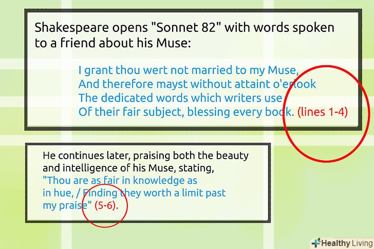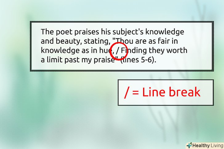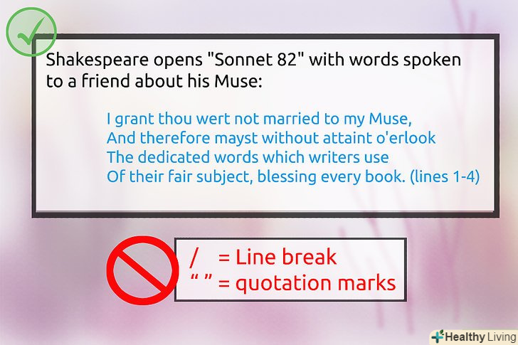 Цитуйте номер рядка.для кожної поетичної цитати в тексті необхідно вказати рядки або номери рядків, які припадають на вашу цитату у вірші.- При укладанні трьох або менше рядків в лапки, розмістіть номери рядків в дужках після закриття лапок. У той же час, цитата повинна йти до точки.