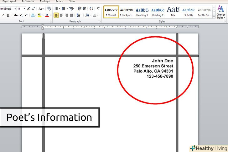 - Цей формат є стандартним, але також прийнятно писати цю інформацію в лівому верхньому кутку сторінки, особливо якщо це робить загальну структуру вірша більш чистою. Увімкніть ту ж інформацію та збережіть текст через одинарний інтервал, але з лівим вирівнюванням.[3]