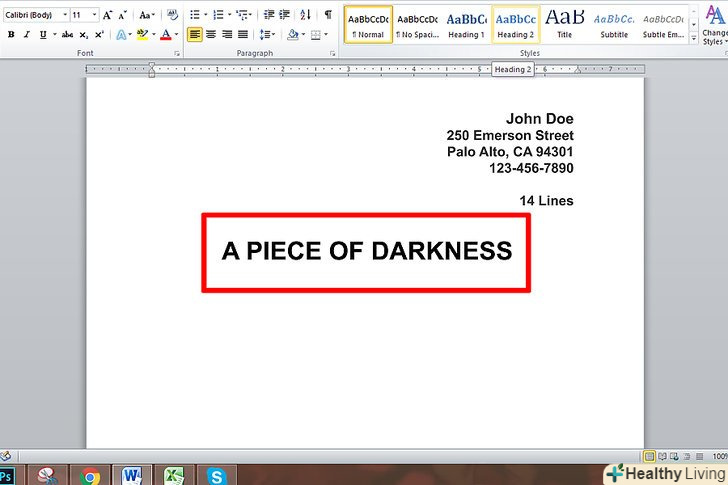 Напишіть назву по центру великими літерами.Відступіть вниз 5-6 рядків, потім введіть назву вашого вірша великими літерами.- Назва зазвичай пишеться по центру сторінки. Якщо ваша контактна інформація вирівнюється по правій частині сторінки, ви можете так само вирівняти Заголовок при бажанні.