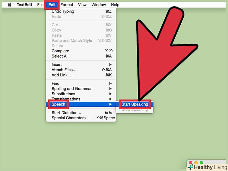 Натисніть Edit gt; Speech gt; Start Speaking. Почнеться озвучування тексту.
