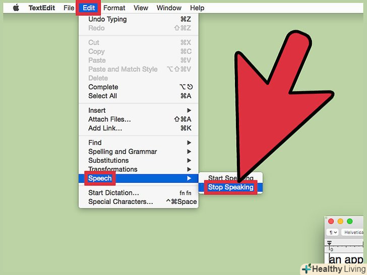 Натисніть Edit gt; Speech gt; Stop Speaking. Озвучування буде зупинено.
