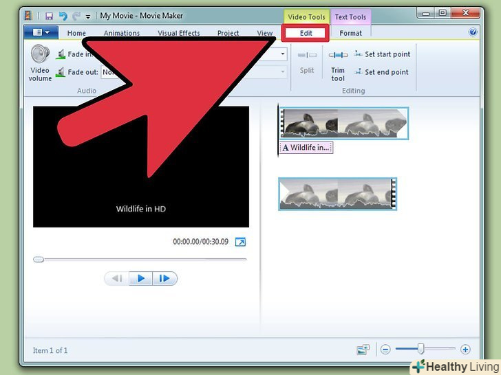 Обрізка відео.ви можете скоротити тривалість відео після того, як воно опиниться на часовій шкалі. Можливо, ви не захочете включати деякі фрагменти і захочете видалити їх, а може бути вам буде потрібно просто зробити відео коротше.- Помістіть курсор на відео, яке ви перенесли на часову шкалу. Виберіть значок, на якому зображені ножиці, який з'являється у вікні відео. Цей інструмент дозволяє обрізати відео.