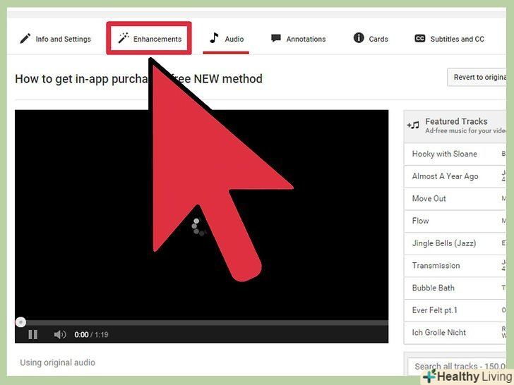 Додайте поліпшення для відео.ви зможете додавати на своє відео фільтри, змінювати колір картинки і робити так, щоб воно виглядало краще.- Щоб застосувати поліпшення для відео, перейдіть в менеджер відео на вашому каналі YouTube. Виберіть відео, яке хочете відредагувати, і натисніть кнопку " Редагувати» («Edit»), а потім перейдіть до пункту«поліпшення»("Enhancements"). Серед запропонованих варіантів виберіть вподобаний, а потім натисніть "Зберегти як «(»Save as").