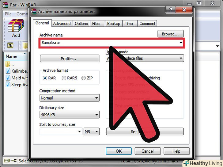 Натисніть " Create RAR "(створити RAR-файл). вам буде запропоновано ввести ім'я файлу і вибрати папку для його збереження.- Примітка: на відміну від WinRAR тут ви не зможете зашифрувати імена файлів.