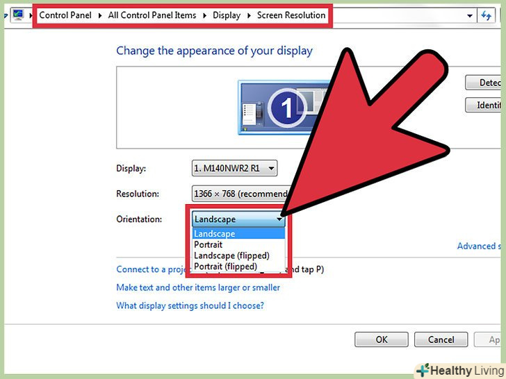 або відкрийте меню Пуск → Панель управління → Екран і виберіть Налаштування параметрів екрану або Дозвіл екрану. - Розкрийте меню "орієнтація «і, в залежності від налаштувань монітора, змініть його на» книжкова «або»альбомна".