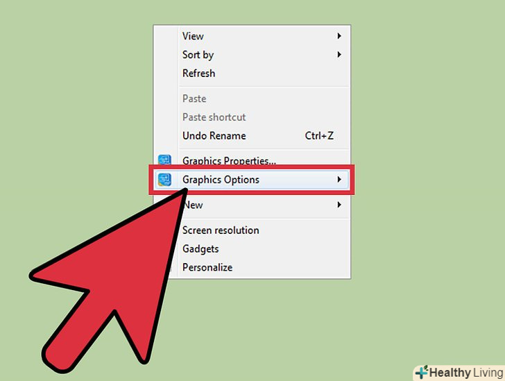 Відкрийте налаштування відеокарти.якщо попередні методи не спрацюють, відкрийте налаштування своєї відеокарти. Залежно від моделі відеокарти, вони будуть розташовані в розділі «налаштування графіки», «параметри графіки», «Панель управління Nvidia», «Центр управління Catalyst» або «Центр управління Intel». Щоб знайти потрібний розділ, скористайтеся функцією пошуку або натисніть правою кнопкою миші на робочому столі і виберіть його з контекстного меню.