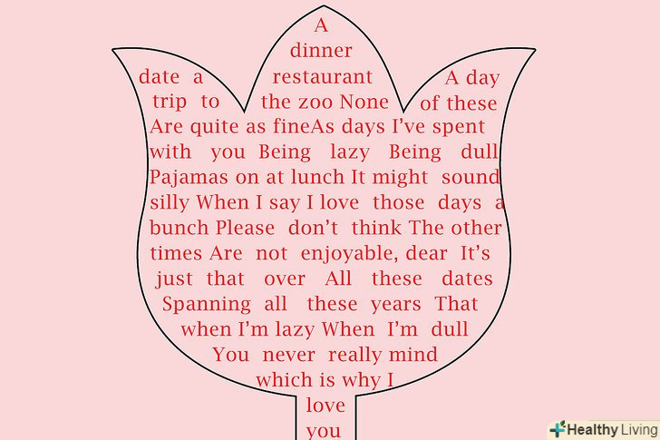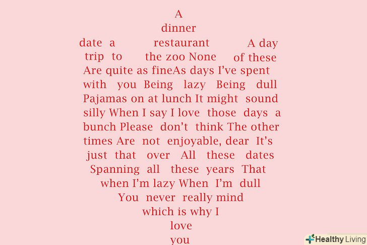 Запишіть текст вірша вздовж накресленої лінії.якщо ви пишете від руки, використовуйте олівець, щоб можна було легко внести поправки. Поекспериментуйте з розміщенням слів. Може знадобитися кілька спроб для досягнення результату, необхідного вам.- Зітріть зовнішні обриси фігури.домігшись необхідного розташування тексту, зітріть обмежували його лінії. Обриси повинні легко вгадуватися по одному тексту.