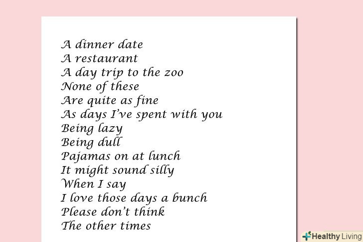 Напишіть вірш.Фігурне вірш не має строгих правил щодо ритму і рими. Найважливіше пам'ятати про те, що ви створюєте з тексту малюнок, і вибирати слова, які підходять для цієї мети. Підберіть слова і фрази, відповідні темі вірша і зручно вписуються в малюнок.