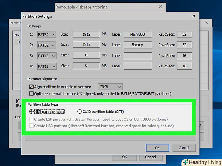 Вкажіть тип кожного розділу.у нижній частині вікна виберіть "MBR»або "GPT". MBR підійде для зберігання даних або для створення завантажувального розділу під старі системи. GPT підійде для роботи з UEFI або для створення завантажувального розділу під нові системи.- Якщо плануєте створити завантажувальний розділ GPT, встановіть прапорець у "Create ESP partition" (створити розділ ESP).