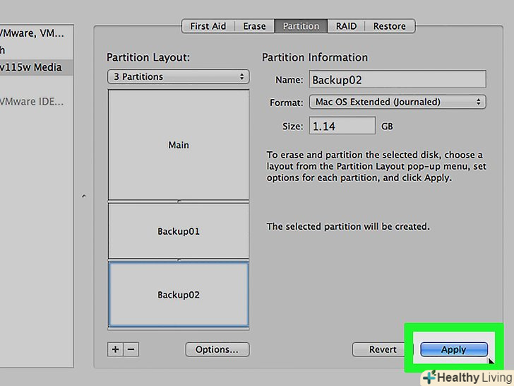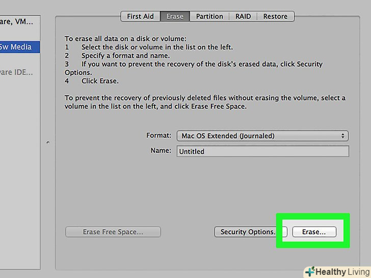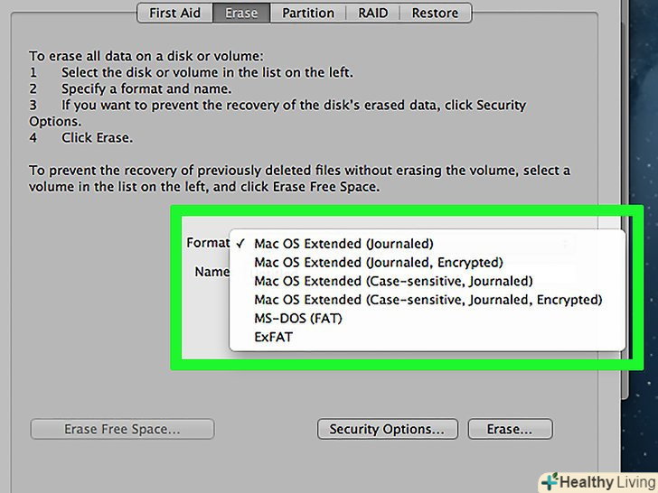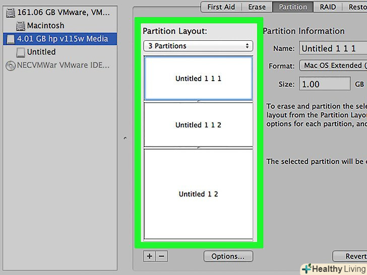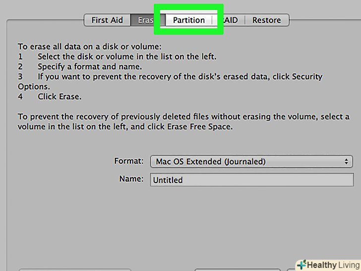 У меню» Схема "виберіть" GUID Partition Map".це дозволить створити розділи на флешці.[2]- У меню «Формат» виберіть " OS X Extended (журнал)». Це спростить зміну розмірів розділів, але флешка буде працювати тільки на комп'ютерах під управлінням Mac OS.
