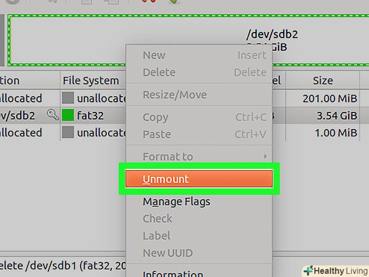 Клацніть правою кнопкою миші по світлому полю у верхній частині екрана і в меню виберіть»Отмонтировать".Отмонтірованіе флешки призведе до її відключення, що необхідно для підготовки до створення розділів.
