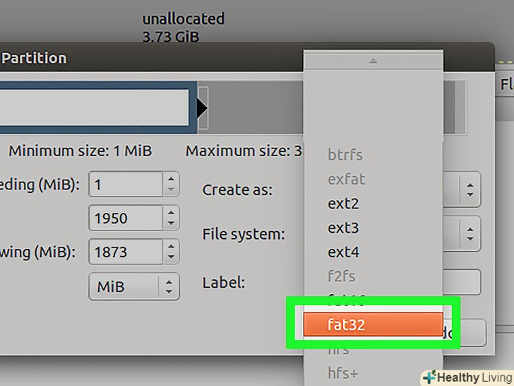 Вкажіть файлову систему.якщо флешка буде працювати тільки на комп'ютерах під управлінням Linux, виберіть «ext2». Якщо з першого розділу буде завантажуватися Windows, виберіть "NTFS" (це можна зробити тільки на першому розділі). Щоб зберігати дані і користуватися флешкою на комп'ютерах під управлінням різних операційних систем, виберіть «fat32» або «exfat».