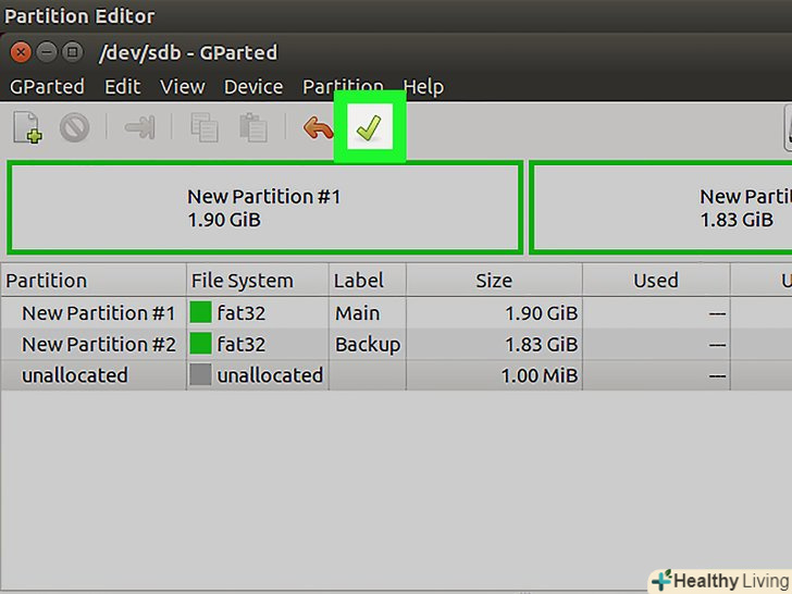 Закінчивши підготовку до створення нових розділів, натисніть на кнопку у вигляді зеленої галочки.натисніть «Застосувати", щоб підтвердити ваше рішення. На флешці будуть створені нові розділи. На це піде деякий час.[4]