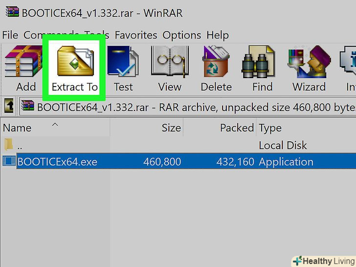 Розпакуйте завантажений файл, щоб витягти Bootice.для цього знадобиться архіватор, що підтримує формат RAR.- 7-Zip-це безкоштовний архіватор, що підтримує формат RAR. Цей архіватор можна завантажити на сайті7-zip.org . встановивши 7-Zip, клацніть по завантаженому архіву (RAR-файлу) правою кнопкою миші і виберіть «7 – Zip» - «розпакувати тут».