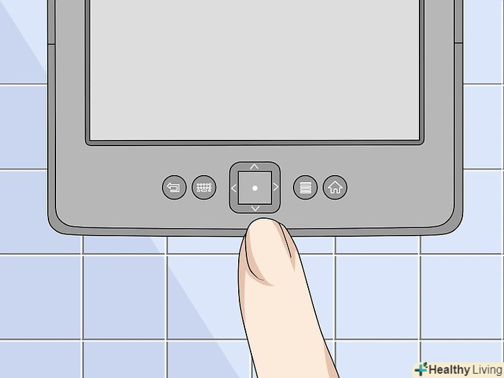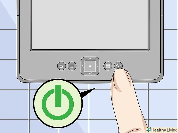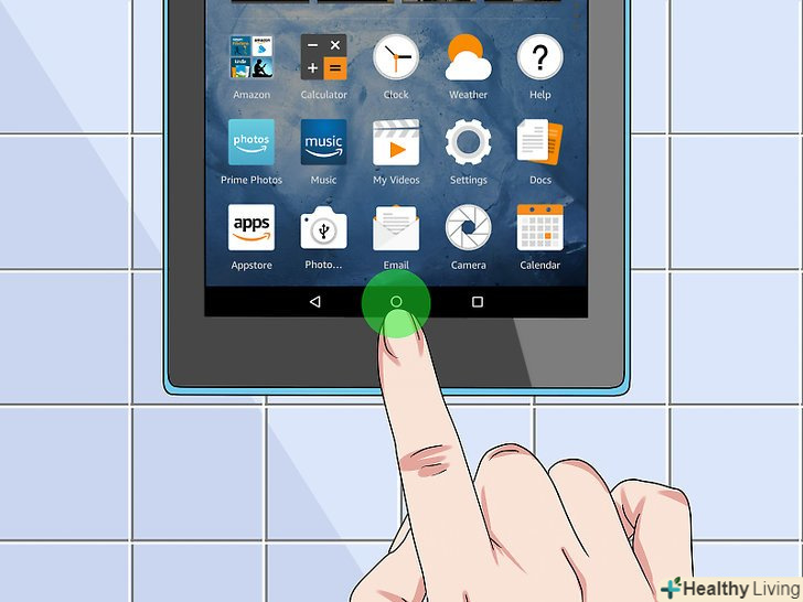 Увімкніть Kindle.перейдіть на головний екран, торкнувшись чорної іконки з білим будиночком.[8]- Утримуйте кнопку живлення, щоб увімкнути пристрій. Візьміть пристрій в руки і натисніть на кнопку живлення і утримуйте її натиснутою протягом декількох секунд. Пристрій Kindle запуститься незабаром після того, як Ви відпустите цю кнопку.