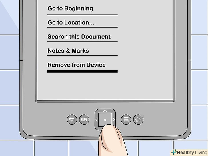 Натисніть вправо на 5-позиційній клавіші, щоб відобразити меню опцій. знайдіть опцію " Remove from Device "(видалити з пристрою) в нижній частині меню. Перейдіть до цієї опції, використовуючи клавішу навігації. Якщо ви впевнені, що хочете заархівувати саме цю книгу, натисніть на центральну кнопку, щоб вибрати «Remove from Device» (видалити з пристрою).[9]- Врахуйте, що заархівований файл може надалі бути відновлений. Архівування лише видаляє файл з пристрою Kindle, не зачіпаючи звіт про покупку і скачування.[10]