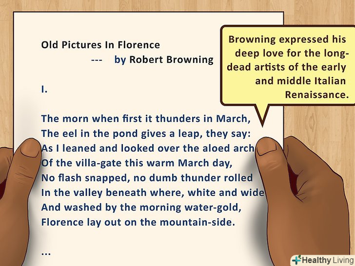 Зверніться за порадою до викладача.завжди корисно звернутися за допомогою до вчителя літератури. Покажіть йому вірш і вислухайте авторитетну думку викладача, а потім поділіться своїми ідеями. Обговоріть можливі підходи до аналізу конкретного вірша і всього жанру.[17]