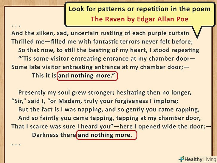 Шукайте закономірності і повторення.у віршах часто використовуються повторення, так як вони дозволяють підкреслити головну ідею або тему. Поет може кілька разів використовувати одну і ту ж рядок у вигляді рефрену, щоб знову і знову нагадати про важливе послання. Також шукайте закономірності у використовуваних словах або структурі вірша, які збільшують інтенсивність. Поет часто повертається до певних образів, тем, слів? Групи схожих слів утворюють комбінації.[12]- Наприклад, у вірші може знову і знову повторюватися одна і та ж рядок:»(і) більше нічого". Задумайтеся над тим, яку мету переслідує автор. Часто таке словосполучення або фраза повертає читача до головної ідеї.