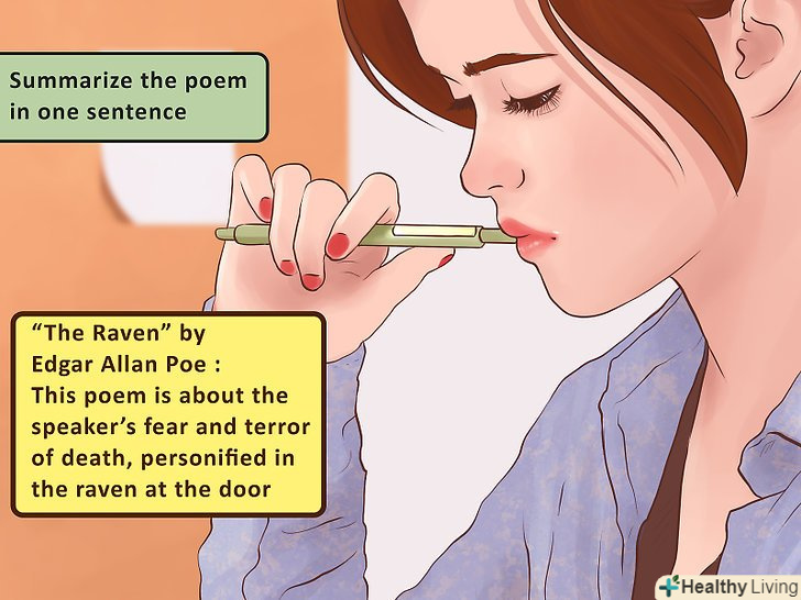 Підведіть підсумок одним реченням.розгляньте всі елементи форми і змісту, а потім спробуйте підсумувати вірш в одному-двох реченнях. Запишіть загальну ідею або тему, як ви її бачите. Покладайтеся на підказки у формі і змісті, а також на власні думки і враження. Задумайтеся, про що це вірш?[14]- Наприклад, вірш» Ворон "Едгара По можна підсумувати Так:»Цей вірш говорить про страх перед смертю, яку уособлює знаходиться за дверима ворон".