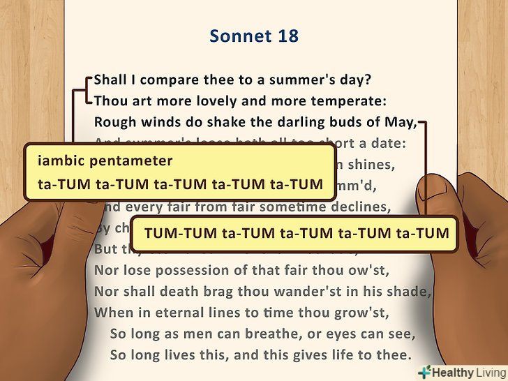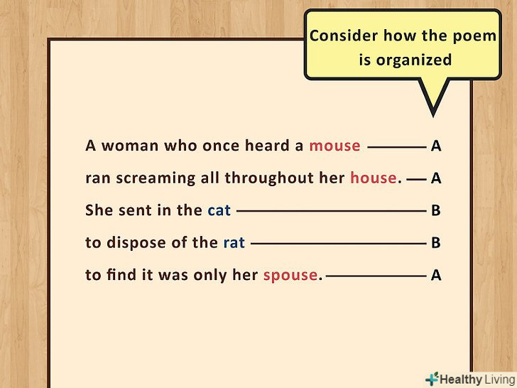 Досліджуйте ритм і розмір вірша.як правило, у кожного вірша є ритм і розмір, якщо воно написано за певною схемою. Читайте вголос, щоб почути і вловити ці аспекти. Єдиний вид поезії, який не слід чіткого ритму і розміру, носить назву верлібр, або вільний вірш. Всі інші вірші слідують певній схемі.[3]- У вірші використовуються рими? Поет римує кожен рядок з наступною? Через рядок? Проаналізуйте схему римування, щоб визначити форму вірша.