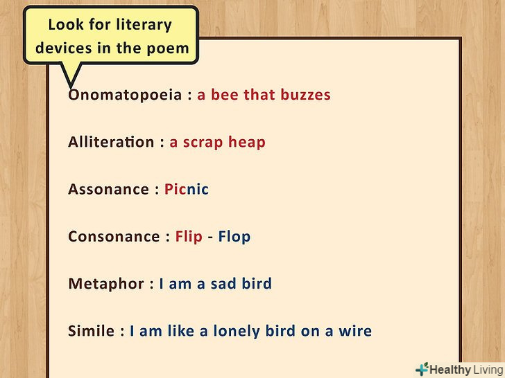 Проаналізуйте літературні прийоми.поети використовують різні літературні прийоми, які дозволяють вкласти у вірш більш глибоке значення і створити розгорнуті образи. Серед поширених літературних прийомів можна виділити рими, ономатопею, алітерацію, асонанси і консонанси. Проаналізуйте всі літературні прийоми вірша і подумайте, який вплив вони роблять на загальний закладений автором сенс.[5]- Рими-повторення кінцевих звуків в словах (наприклад, «особа» і «ганок»). Цей прийом може використовуватися як в рамках одного рядка, так і в кінці двох окремих рядків.