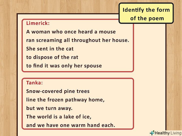 Визначте форму вірша.проаналізувавши розмір, структуру і схему римування, визначте форму вірша. Існують різні поетичні форми: сонети, балади, акростихи, білі вірші, хайку (хокку), СІНКВЕЙНИ, епічні поеми, елегії, лімерики, секстіни і вілланелли. Важливо визначити форму вірша, щоб краще зрозуміти текст і вловити задум поета.[6]- Прочитайте приклади різних поетичних форм, щоб не помилитися у визначенні. Також можна вивчити відмінні риси конкретної форми.