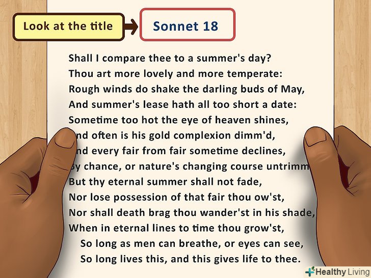 Розгляньте назву.назва завжди містить важливі натяки на характер вірша, тому обов'язково приділіть йому увагу. Перечитайте і обміркуйте назву з урахуванням тексту. Подумайте, яке значення вклав автор у назву в контексті змісту вірша. Чи робить назва глибшою основну думку?[7]- Іноді назва вказує на те, до кого звертається поет, наприклад «Лист матері» або «до одного». Також назва може описувати предмет, жанр або тональність вірша, наприклад, «Сонет 18» або «Елегія».