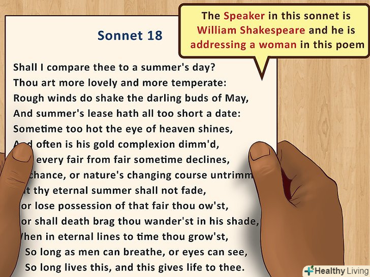 Визначте оповідача.поет і оповідач — не завжди одне і те ж обличчя. Розповідь може вестися від імені персонажа вірша. Автор може писати в першому (»я«), другому (»ти«,» ви«) або третьому (»він«,» вона«,» вони") особі.[8]- Зазвичай оповідача можна визначити без глибокого аналізу, але в разі сумнівів зараз не потрібно про це переживати. Просто постарайтеся правильно зрозуміти, в якій особі ведеться розповідь.
