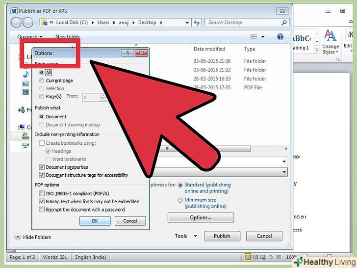 Налаштуйте параметри. Файл можна оптимізувати для публікації в Інтернеті, тобто зробити його менше, але менш якісним. Також можна натиснути Параметри і вказати сторінки (і інші параметри), які будуть включені в PDF-документ. За замовчуванням в PDF-файл буде перетворений весь документ.