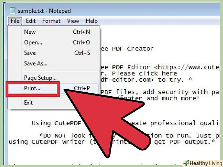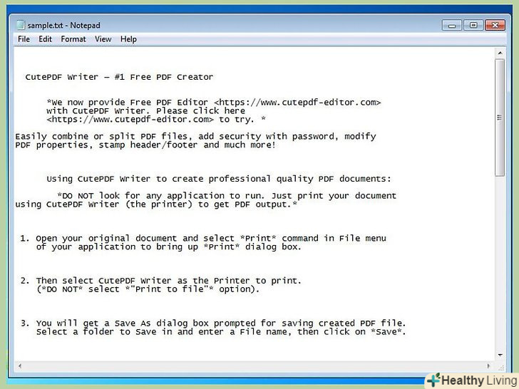 Відкрийте TXT-файл у блокноті. також цим методом можна скористатися, щоб перетворити в формат PDF інші текстові файли, наприклад, CFG або INI.