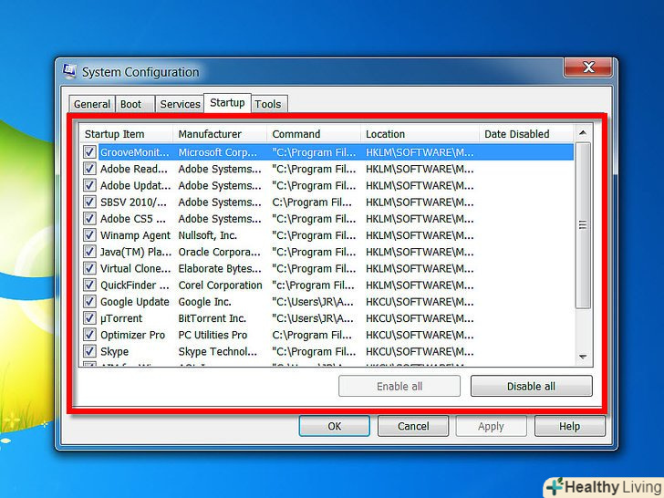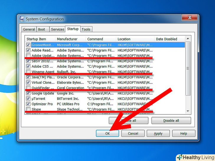 Приберіть галки у програм, які не повинні автоматично запускатися.- Цілком ймовірно, що в цьому списку будуть такі програми, про які ви взагалі не знаєте, або не знаєте про те, що вони автоматично запускаються. Більшість користувачів встановлюють безліч програм, якими вони рідко користуються або взагалі не користуються. Однак такі програми» прописуються " в автозавантаженні і знижують швидкодію комп'ютера.