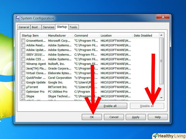 Якщо ви хочете видалити всі програми з автозавантаження, натисніть «Відключити все» в правому нижньому кутку екрану.- Робіть так з крайньою обережністю, тому що в автозавантаженні завжди є кілька програм, які вам потрібні і які повинні запускатися під час завантаження системи, наприклад, антивірус і брандмауер.