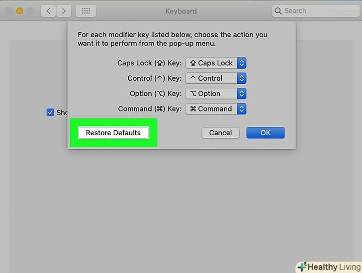 НатиснітьНалаштування за замовчуванням gt; OK . ця опція знаходиться в нижньому лівому кутку вікна. Будуть скинуті всі налаштування клавіш-модифікаторів (наприклад, клавіші ⌘ Command ).