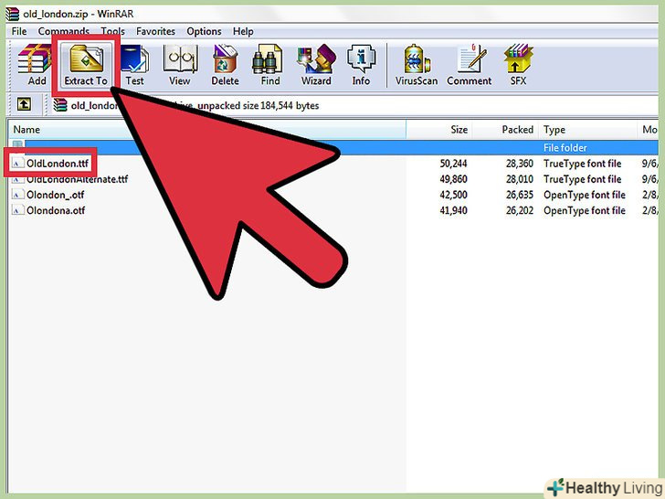 Витягніть файл у будь-яку папку.а ще краще витягніть його на робочий стіл. Вийміть або сам файл, або папку цілком.- Не важливо, куди ви витягнете архів. Це навіть можна зробити прямо в папку зі шрифтами.