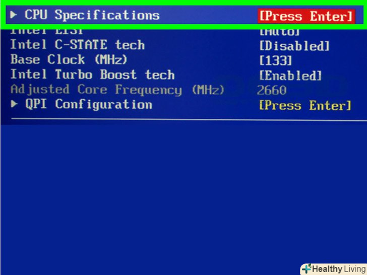 Знайдіть налаштування процесора. інтерфейс BIOS залежить від виробника материнської плати. У більшості випадків налаштування процесора знаходяться в розділі / меню «CPU Specifications "(Характеристики процесора), «CPU Features» (функції процесора), «Advanced Core Features» (додаткові функції процесора) або аналогічному.- За допомогою клавіш зі стрілками виділіть потрібний розділ, меню або опцію, а потім натисніть↵ Enter, щоб вибрати їх.