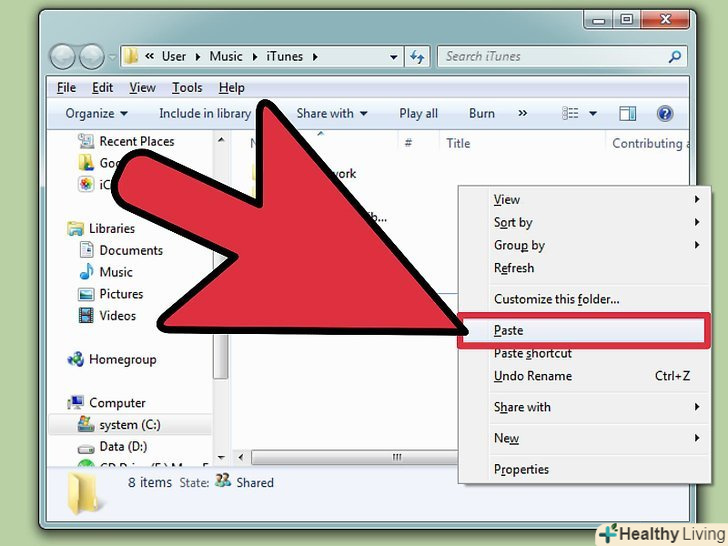 Скопіюйте папку iTunes з жорсткого диска.Замініть вже існуючу папку iTunes. Чим більше бібліотека, тим довше займе копіювання. По завершенні копіювання iTunes автоматично перезавантажить всю інформацію по пісням, рейтингам, плейлистам і інших налаштувань.[2]- Якщо вам потрібно додати існуючу бібліотеку назад на iTunes, клікніть " файл "і виберіть"Додати папку в бібліотеку". Перейдіть в папку, куди хочете додати музику, і клікніть OK. Це потрібно зробити після того, як закінчиться завантаження бібліотеки з жорсткого диска.