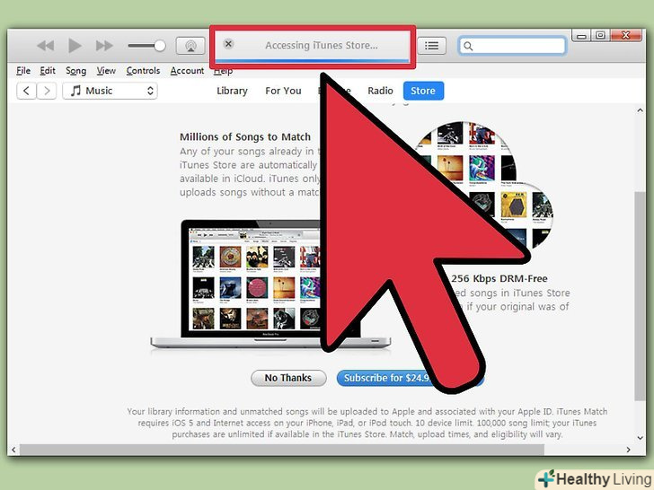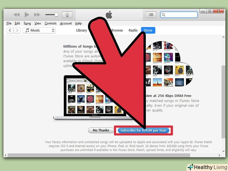 Зареєструйтеся на iTunes Match.за використання iTunes Match потрібно платити річну плату. Цей сервіс зберігає всі музичні файли через iCloud, включаючи і всі файли, які ви не купували через iTunes, в тому числі файли з дисків і файли, звідкись завантажені. Якщо у вас багато музики, яку ви через iTunes не купували, то сервіс буде вельми корисний.- Щоб зареєструватися на iTunes Match, клікніть на меню " магазин "і виберіть"Включити iTunes Match". Після цього потрібно буде ввести Apple ID і пароль, після цього ви перейдете на сторінку замовлення.